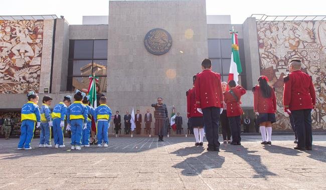 Este lunes, la secretaria de Gobernación, Rosa Icela Rodríguez, encabezó la primera ceremonia de izamiento y abanderamiento a escuelas de educación básica.
