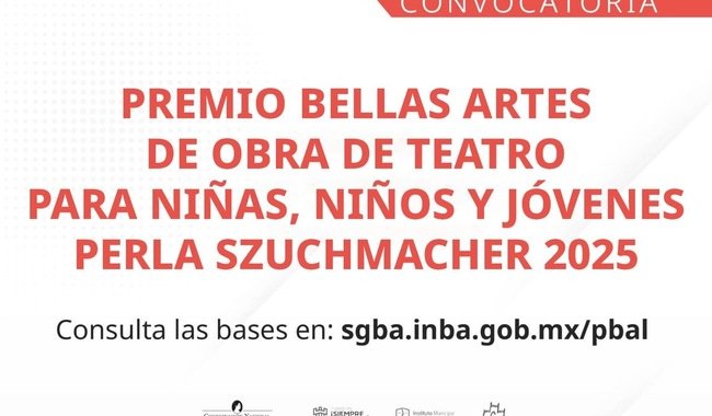La Secretaría de Cultura del Gobierno de México y el Instituto Nacional de Bellas Artes y Literatura (INBAL), a través de la Coordinación Nacional de Literatura (CNL), y el Municipio de Torreón, mediante el Instituto Municipal de Cultura y Educación de Torreón y del Patronato del Teatro Isauro Martínez, convocan al Premio Bellas Artes de Obra de Teatro para Niñas, Niños y Jóvenes Perla Szuchmacher 2025.