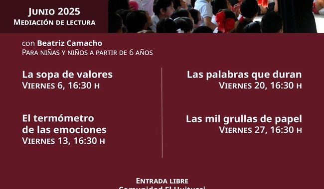 Las actividades de este espacio serán guiadas por la promotora cultural Beatriz Camacho los viernes de cada mes a las 16:30 h, comenzando el próximo 6 de junio con la narración “Sopa de valores”, inspirada en el cuento La sopa de piedra, donde niñas y niños descubrirán qué ingredientes necesita una comunidad para vivir en armonía.