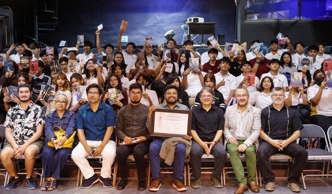 En su mensaje, el autor galardonado, Alexis Casas Eleno, compartió que a los 17 años realizó su primer ejercicio de escritura plasmando pensamientos en un diario. Invitó a las y los jóvenes, alumnado del Centro de Estudios Científicos y Tecnológicos (CECyTE) Bella Vista, a seguir sus sueños, no desistir y entender que equivocarse no significa detenerse, sino retomar el camino: “A veces le tenemos miedo a equivocarnos, a errar, pero cuando se sigue el impulso del corazón decimos: aquí estoy, este es mi lugar”.