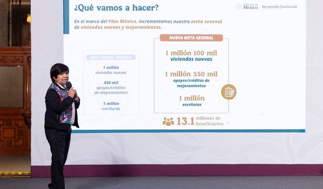 Durante la Mañanera del Pueblo, la secretaria detalló que para 2025 serán edificadas 186 mil viviendas nuevas sólo para quienes ganen no más de dos salarios mínimos, de las cuales, 86 mil serán construidas por la Conavi para personas no derechohabientes y 100 mil a cargo del Infonavit; se darán 300 mil apoyos para mejoramiento o ampliación. Además, mediante el Instituto Nacional del Suelo Sustentable (Insus) se regularizarán más de 120 mil escrituras. Habrá 13. 1 millones de beneficiarios, apuntó.