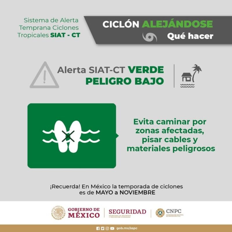 Alerta Naranja de alejamiento para el noreste, centro, norte y noroeste de Yucatán; Alerta Amarilla norte para Campeche; oeste, este y sur de Yucatán; norte de Quintana Roo; Alerta Verde para el este y centro de Campeche; centro y Oeste de Quintana Roo y Alerta Azul para el sur y suroeste de Campeche; sur de Quintana Roo.