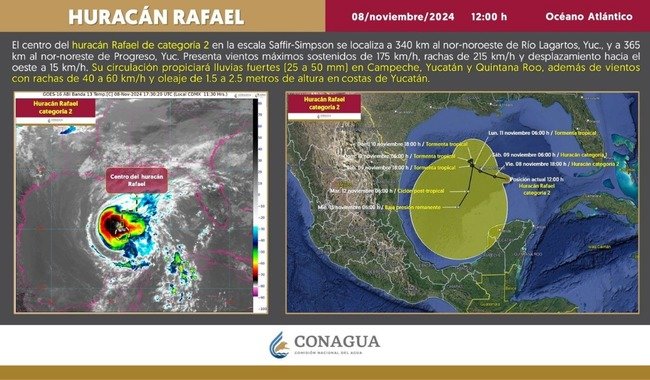 De acuerdo con la información proporcionada por el Servicio Meteorológico Nacional (SMN), el huracán Rafael, actualmente de categoría 2 en la escala Saffir-Simpson, generará en las próximas horas fuertes lluvias en los estados de Campeche, Quintana Roo y Yucatán. Además, se prevén rachas de viento de entre 40 y 60 km/h, así como oleaje elevado de 1.5 a 2.5 metros en el litoral de Yucatán.