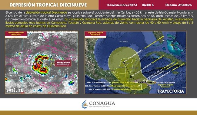 Las autoridades de los tres niveles de gobierno mantienen un monitoreo permanente de la Depresión Tropical Diecinueve, que se dirige hacia el sur del territorio mexicano. La Coordinación Nacional de Protección Civil (CNPC), de la Secretaría de Seguridad y Protección Ciudadana (SSPC), opera una Misión de Enlace y Coordinación (ECO) en el estado de Quintana Roo, con el objetivo coordinar acciones preventivas y preparatorias para salvaguardar la integridad de la ciudadanía y de los visitantes que se encuentran en la región.