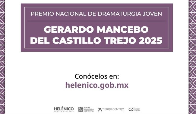 La Secretaría de Cultura, a través del Centro Cultural Helénico, la Compañía Nacional de Teatro y el Fondo de Cultura Económica, anuncia a los finalistas del Premio Nacional de Dramaturgia Joven Gerardo Mancebo del Castillo Trejo 2025, una iniciativa dirigida a dramaturgas y dramaturgos de entre 20 y 29 años de toda la República mexicana. Este premio celebra 25 años de trayectoria y se consolida como un certamen único en su tipo, por su impulso al pensamiento escénico joven en el país.