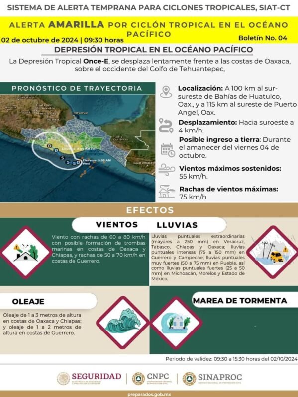 El Servicio Meteorológico Nacional (SMN) pronostica que la depresión tropical Once-E, ubicada frente a las costas de Oaxaca, se intensificará en las próximas horas a tormenta tropical. Ante esta situación, la Coordinación Nacional de Protección Civil (CNPC) hace un llamado a las autoridades de Protección Civil y a la población en general de Oaxaca, Chiapas, Veracruz y Tabasco a tomar medidas preventivas ante las lluvias intensas previstas.