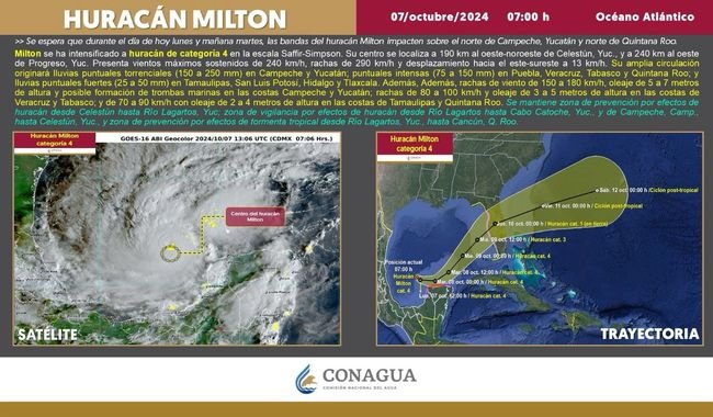 El Servicio Meteorológico Nacional (SMN) informó que «Milton» se ha intensificado a huracán categoría 4, se localiza a 240 km al oeste de Progreso, México y a mil 185 km al suroeste de Tampa, Florida, presenta vientos máximos sostenidos de 240 km/h y se desplaza al este-sureste a 13 km/h.