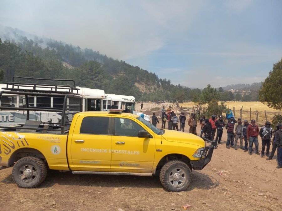 En este punto, los trabajos de combate y mitigación están a cargo 13 combatientes oficiales de la Conafor, 10 combatientes de brigadas rurales estatales, 30 de Protección Forestal Municipal, 16 de Gobierno Estatal y 20 personas propietarias.