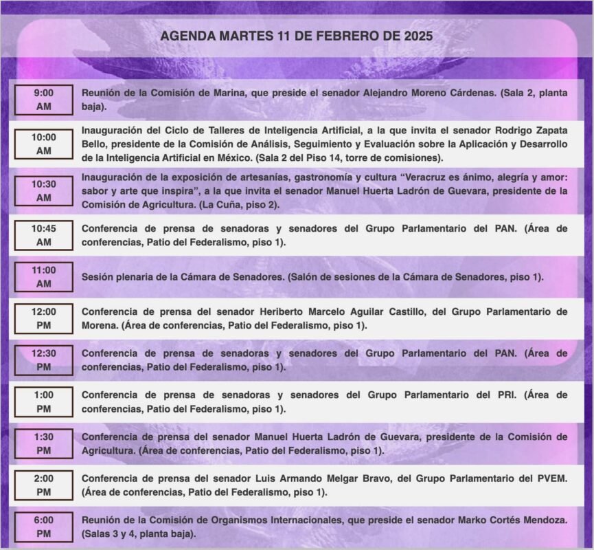 Senado de la RepublicaInfografías Consulta la agenda de actividades de #HoyEnElSenado. Por Araceli Bastida - febrero 11, 2025 0 FacebookTwitterPinterestLinkedinReddItEmailWhatsAppTelegramVK