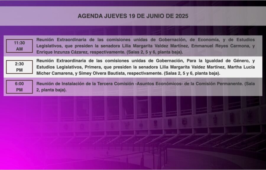 Senado de la RepublicaInfografías Consulta la agenda de #HoyEnElSenado. Por Araceli Bastida - junio 19, 2025 0 FacebookTwitterPinterestLinkedinReddItEmailWhatsAppTelegramVK