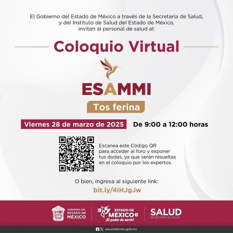 TOLUCA, Estado de México. – Para impulsar la capacitación del sector salud, el Gobierno del Estado de México convoca a médicas y médicos, enfermeras y enfermeros del primer nivel de atención y personal en formación, al Coloquio Virtual Estrategia en Salud para Abatir la Morbi- Mortalidad Infantil (ESAMMI) Tosferina, que se realizará el viernes 28 de marzo próximo.