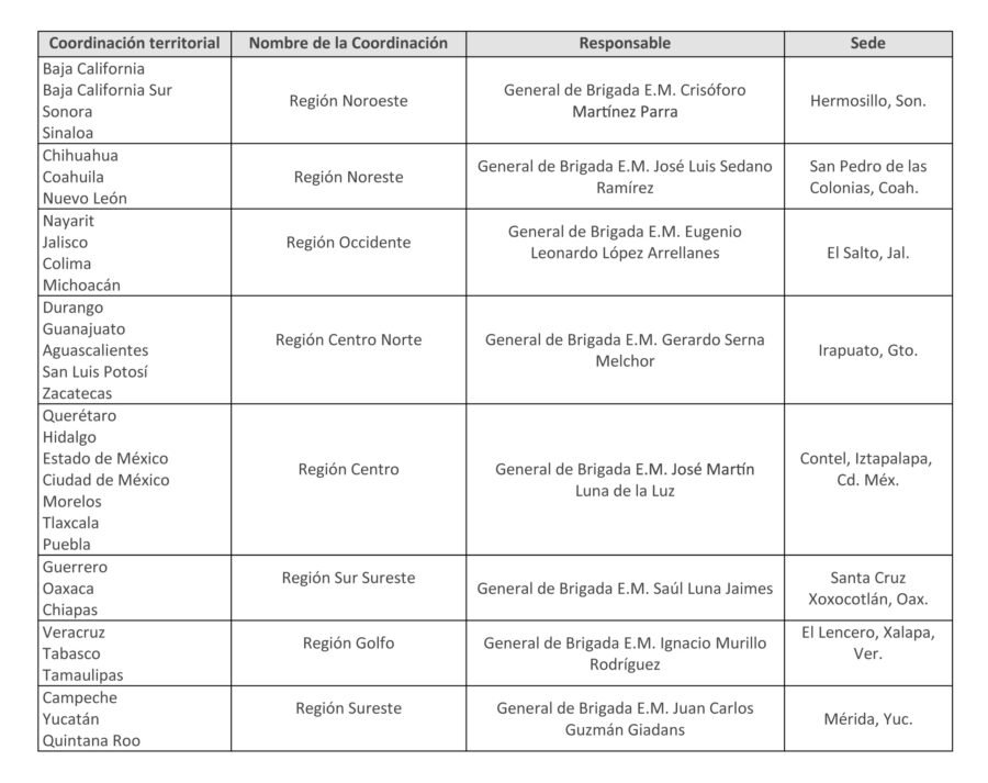 - Los mandos de estas Coordinaciones Territoriales fueron cubiertos por Generales en el activo que prestan sus servicios en citada Institución, de acuerdo con los procedimientos institucionales de la Secretaría de la Defensa Nacional.