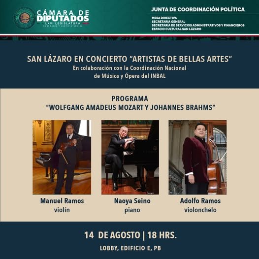 Camara de DiputadosInfografías Disfruta de #SanLázaroEnConcierto con la participación de Manuel Ramos, Naoya Seino y Adolfo Ramos, quienes interpretarán obras de Wolfgang Amadeus Mozart y Johannes Brahms. Por Araceli Bastida - agosto 14, 2025 0 FacebookTwitterPinterestLinkedinReddItEmailWhatsAppTelegramVK