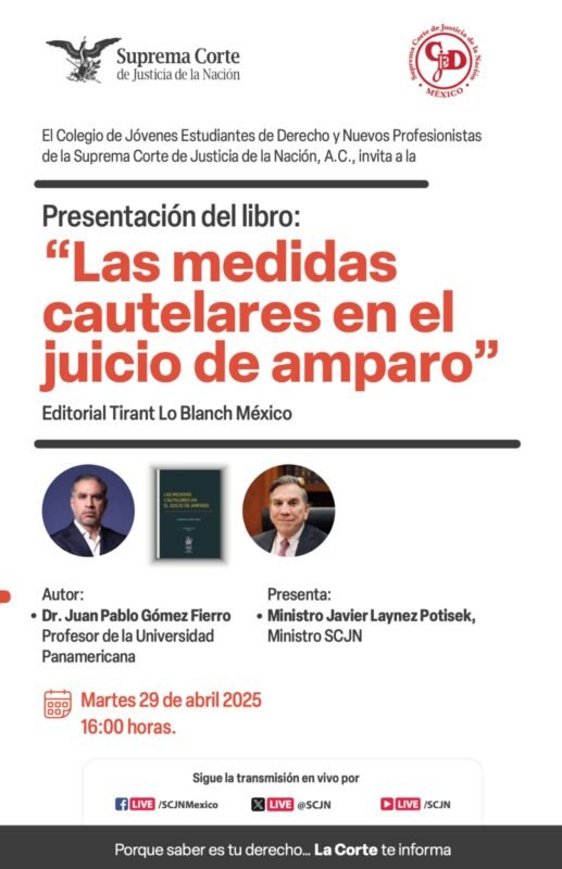 El Colegio de Jóvenes Estudiantes de Derecho y Nuevos Profesionistas de #LaCorte te invita a la Presentación del Libro “Las medidas cautelares en el juicio de amparo” de la autoría de Juan Pablo Gómez Fierro.