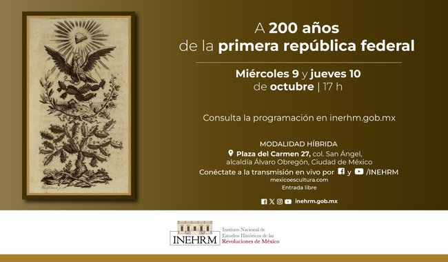 El encuentro académico se llevará a cabo el miércoles 9 y el jueves 10 de octubre, a las 17:00 h, de manera presencial en la sede del instituto (Plaza del Carmen 27, San Ángel, CP 01000, alcaldía Álvaro Obregón) y será transmitido en directo por Facebook (/inehrm.fanpage) y YouTube (/Canal Inehrm).
