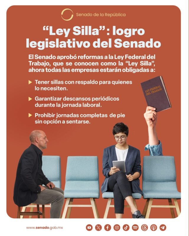 Senado de la RepublicaInfografías El Senado aprobó reformas a la Ley Federal del Trabajo enfocadas a cuidar la salud y dignidad de todas las personas trabajadoras. Conoce más sobre la #LeySilla. Por Araceli Bastida - junio 19, 2025 0 FacebookTwitterPinterestLinkedinReddItEmailWhatsAppTelegramVK