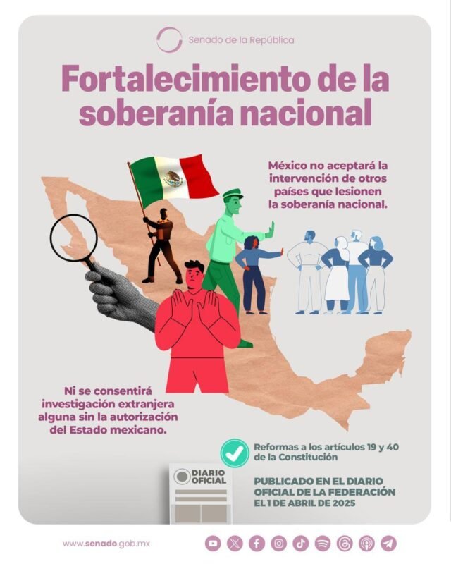 El Senado reformó la Constitución para establecer que no se aceptarán intervenciones, intromisiones o cualquier acto desde el extranjero, que afecte la integridad, independencia y soberanía de la Nación. Consulta esta modificación en el Diario Oficial de la Federación.