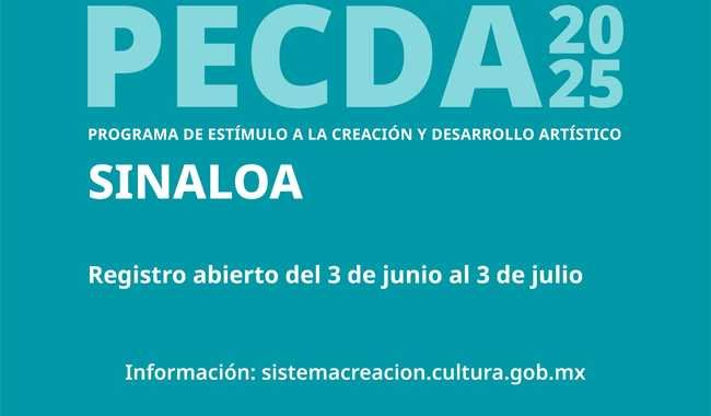 La Secretaría de Cultura del Gobierno de México, a través del Sistema Creación, en coordinación con el Gobierno del estado de Sinaloa por medio del Instituto Sinaloense de Cultura, publican la convocatoria del Programa de Estímulo a la Creación y Desarrollo Artístico (PECDA) 2025, para impulsar el trabajo artístico de los creadores sinaloenses.