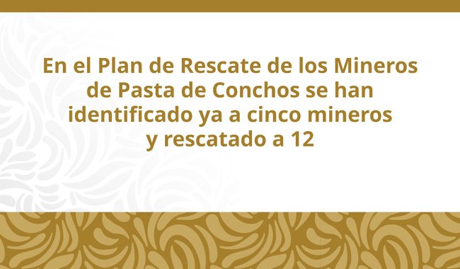 Como parte de los trabajos del Plan Integral de Reparación y Justicia en Pasta de Conchos, iniciado el 1° de mayo de 2019, se han recuperado los restos de 12 mineros y se ha localizado un decimotercero, cuyos trabajos de rescate están en curso. Esto representa un avance significativo en el esfuerzo por traer de vuelta a casa a quienes quedaron atrapados en la mina el 19 de febrero de 2006.