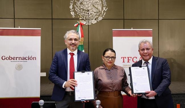 La secretaria de Gobernación, Rosa Icela Rodríguez, y el magistrado presidente del TFCA, José Luis Rodríguez, encabezaron la entrega del documento al presidente de la FSTSE, Marco Antonio García Ayala.