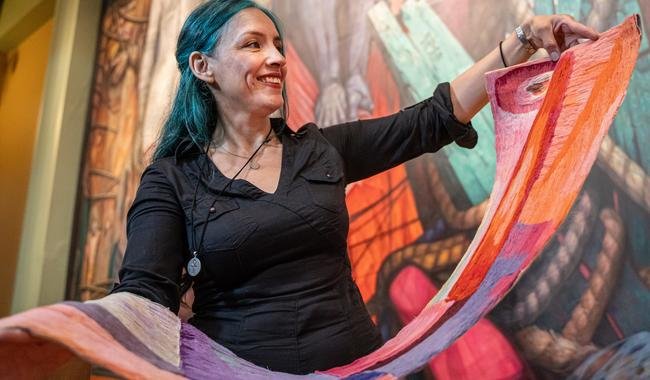 Para el Volumen 3 de Muralismo Desbordado, la también jalisciense Isa Carrillo creó una instalación compuesta por 12 piezas textiles, intervenidas por diversas técnicas que, como fantasmas, se suspenden en espiral dentro del área de murales del MPBA para envolver a las y los espectadores en un diálogo místico que yuxtapone su obra con la de González Camarena.