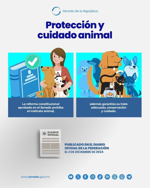 Senado de la RepublicaInfografías Este 2 de diciembre se publicó en el Diario Oficial de la Federación, la reforma constitucional con la que se prohíbe el maltrato animal. Por Araceli Bastida - diciembre 6, 2024 0 FacebookTwitterPinterestLinkedinReddItEmailWhatsAppTelegramVK