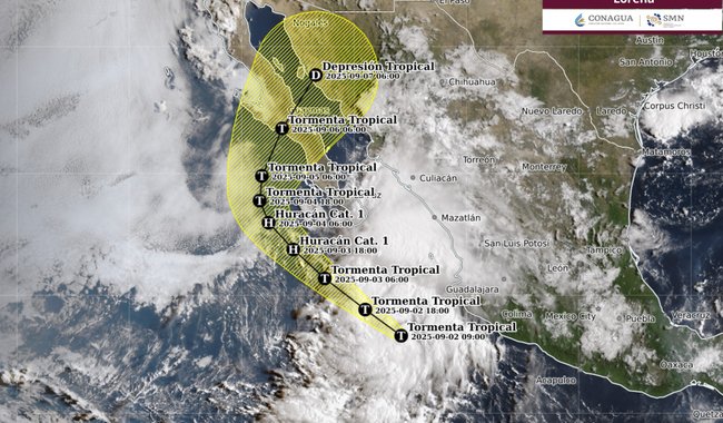 El coordinador general del Servicio Meteorológico Nacional (SMN), de Conagua, Fabián Vázquez Romaña, explicó que, desde hoy hasta el próximo sábado, Lorena, actualmente tormenta tropical, en combinación con el monzón mexicano y una vaguada en altura, ocasionará lluvias de muy fuertes a torrenciales, con acumulados de 250 a 350 milímetros (mm), en el occidente y noroeste de México. Hizo énfasis en que, de acuerdo con los modelos de pronóstico, podría impactar entre el viernes y el sábado en la costa occidental de Baja California Sur.