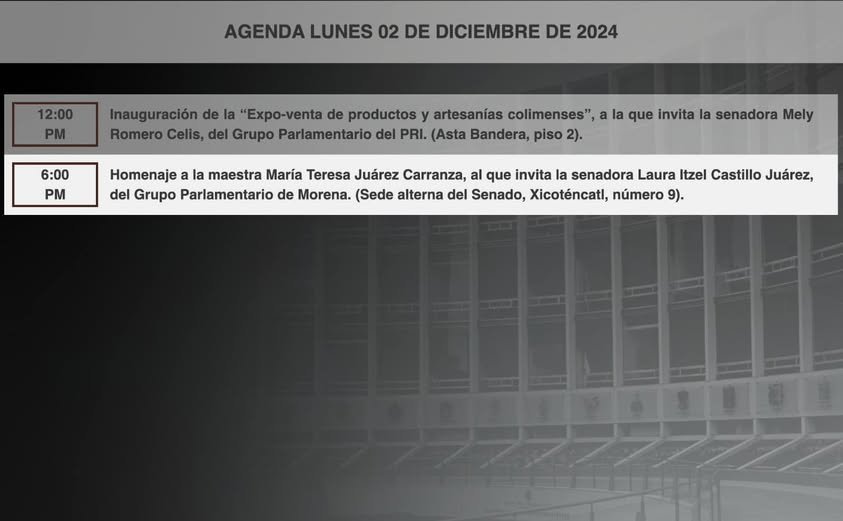 Senado de la RepublicaInfografías #HoyEnElSenado se desarrollará la siguiente agenda de actividades. Por Araceli Bastida - diciembre 2, 2024 0 FacebookTwitterPinterestLinkedinReddItEmailWhatsAppTelegramVK