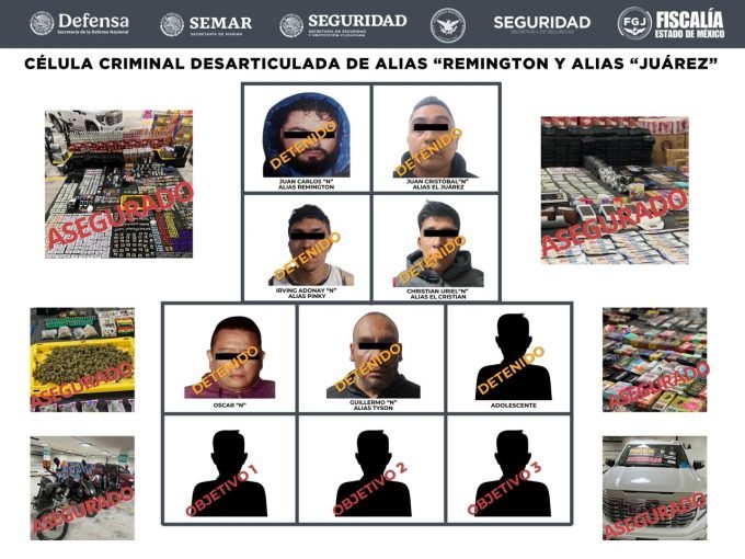 Como resultado de las acciones operativas llevadas a cabo en contra de la célula delictiva de alias “Remington” y alias “Juárez”, el 12 de noviembre pasado, DEFENSA, MARINA, SSPC, GN, Fiscalía mexiquense y SSEM, lograron la detención de (1) Christian Uriel “N” alias el “Cristian”, (2) Irvin Adonay “N” alias “Pinky” y (3) Guillermo “N” alias “Tyson”.