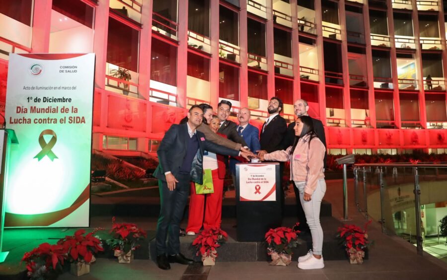 Los senadores José Manuel Cruz Castellanos y Emmanuel Reyes Carmona, presidentes de las comisiones de Salud y Economía, respectivamente, encabezaron la iluminación de las instalaciones del Senado de color rojo con motivo del Día Internacional de la Lucha contra el SIDA, que se conmemora el 1 de diciembre de cada año, con el fin de concientizar sobre la prevención, detección y tratamiento de esta enfermedad.