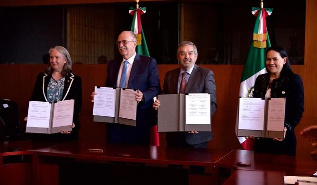 El canciller Juan Ramón de la Fuente y el titular de Agricultura, Julio Berdegué Sacristán, junto con la directora ejecutiva de la Agencia Mexicana de Cooperación Internacional para el Desarrollo (AMEXCID), Alejandra del Moral Vela y la directora de Ciencia e Innovación del Centro Internacional de Mejoramiento de Maíz y Trigo (CIMMYT), Sarah Hearne, signaron los convenios que impulsarán la cooperación técnica y científica internacional, alineada con el Plan para fortalecer la soberanía y autosuficiencia alimentaria anunciado por la presidenta Claudia Sheinbaum Pardo, en el marco del Plan México.