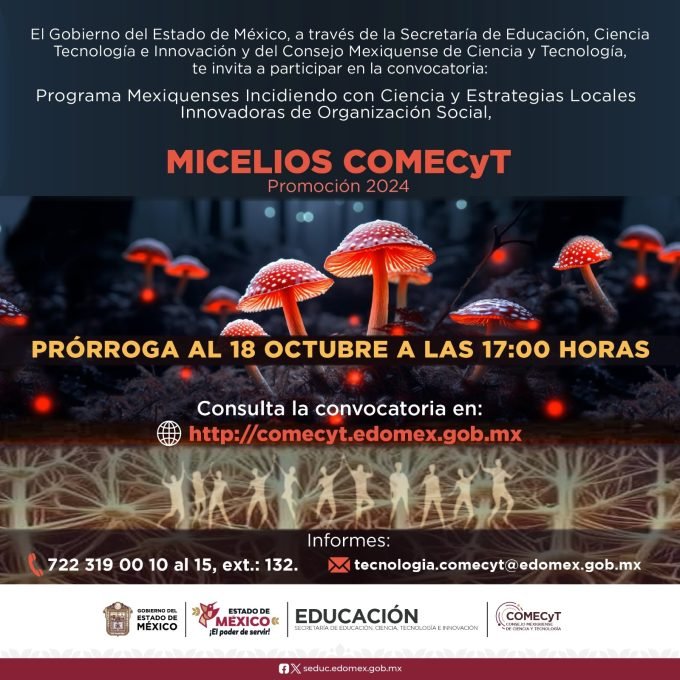 • Publican convocatoria en: https://comecyt.edomex.gob.mx/micelios-comecyt; permanecerá abierta hasta el 18 de octubre a las 17:00 horas.