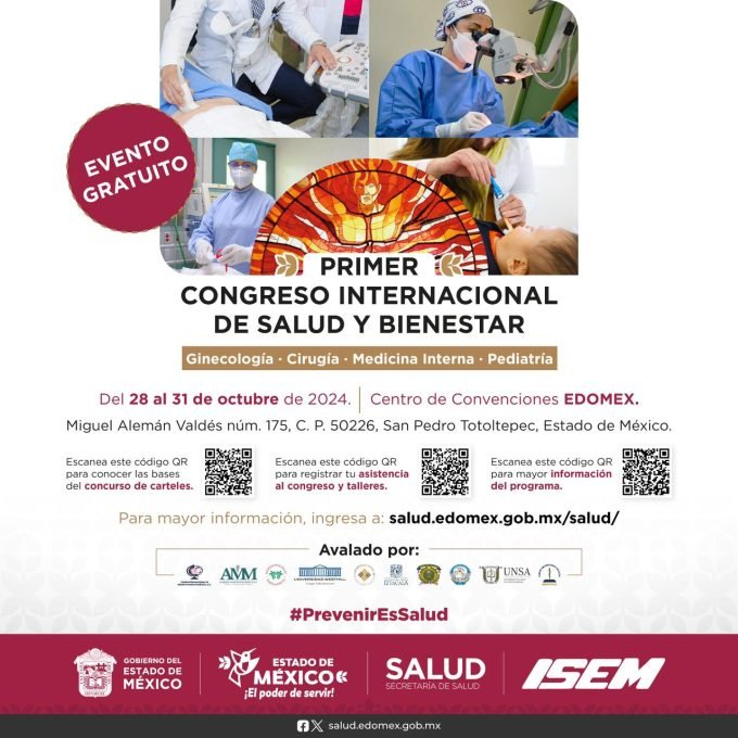 TOLUCA, Estado de México.- El Gobierno del Estado de México, a través de la Secretaría de Salud invita a la comunidad médica a participar en el Primer Congreso Internacional de Salud y Bienestar 2024, el cual estará enfocado en ginecología, medicina interna, cirugía y pediatría.