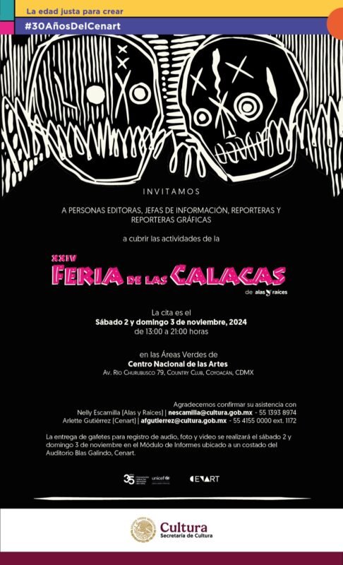 Inicio Secretarias 06 Secretaría de Cultura Invitación: XXIV Feria de las Calacas de Alas y Raíces Secretarias06 Secretaría de CulturaGobierno de México Invitación: XXIV Feria de las Calacas de Alas y Raíces Por Noticiero Gubernamental - octubre 31, 2024 24 0 FacebookTwitterPinterestLinkedinReddItEmailWhatsAppTelegramVK Secretaría de Cultura | 31 de octubre de 2024 | Comunicado Artículos relacionadosMás del autor Conferencia de prensa matutina. Martes 16 de diciembre 2025 | Presidenta Claudia Sheinbaum #MañaneraDelPueblo desde Palacio Nacional. Lunes 15 de diciembre 2025 #MañaneraDelPueblo desde Palacio Nacional. Jueves 11 de diciembre 2025 Registrarse ¡Bienvenido! Ingresa en tu cuenta tu nombre de usuario tu contraseña ¿Olvidaste tu contraseña? consigue ayuda Recuperación de contraseña Recupera tu contraseña tu correo electrónico Se te ha enviado una contraseña por correo electrónico. Lo más reciente Conferencia de prensa matutina. Martes 16 de diciembre 2025 | Presidenta... Esmeralda Fuentes - diciembre 16, 2025 0 https://youtu.be/IWd9ftarYmI #MañaneraDelPueblo desde Palacio Nacional. Lunes 15 de diciembre 2025 diciembre 15, 2025 #MañaneraDelPueblo desde Palacio Nacional. Jueves 11 de diciembre 2025 diciembre 11, 2025 #MañaneraDelPueblo desde Palacio Nacional. Miércoles 10 de diciembre 2025 diciembre 10, 2025 #MañaneraDelPueblo desde Palacio Nacional. Martes 09 de diciembre 2025 diciembre 9, 2025 Mañaneras Conferencia de prensa matutina. Martes 16 de diciembre 2025 | Presidenta... Esmeralda Fuentes - diciembre 16, 2025 0 https://youtu.be/IWd9ftarYmI #MañaneraDelPueblo desde Palacio Nacional. Lunes 15 de diciembre 2025 diciembre 15, 2025 #MañaneraDelPueblo desde Palacio Nacional. Jueves 11 de diciembre 2025 diciembre 11, 2025 #MañaneraDelPueblo desde Palacio Nacional. Miércoles 10 de diciembre 2025 diciembre 10, 2025 #MañaneraDelPueblo desde Palacio Nacional. Martes 09 de diciembre 2025 diciembre 9, 2025