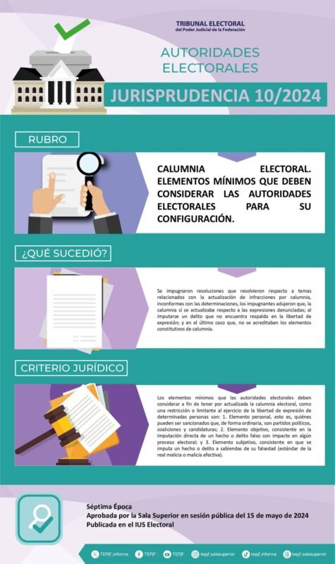 Inicio Tribunal Electoral del Poder Judicial de la Federación Infografías Jurisprudencia 10/2024 Rubro: Calumnia electoral. Elementos mínimos que deben considerar las autoridades...