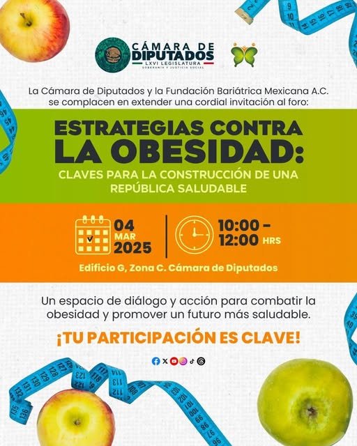Camara de DiputadosInfografías La #CámaraDeDiputados y la Fundación Bariátrica mexicana te invitamos al foro “Estrategias contra la obesidad: Claves para la construcción de una república saludable”. Por Araceli Bastida - marzo 3, 2025 0 FacebookTwitterPinterestLinkedinReddItEmailWhatsAppTelegramVK