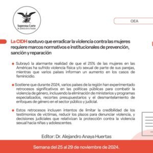 Suprema Corte de Justicia de la NaciónInfografías La CIDH sostuvo que erradicar la violencia contra las mujeres requiere marcos normativos e institucionales de prevención, sanción y reparación. Por Araceli Bastida - diciembre 2, 2024 0 FacebookTwitterPinterestLinkedinReddItEmailWhatsAppTelegramVK