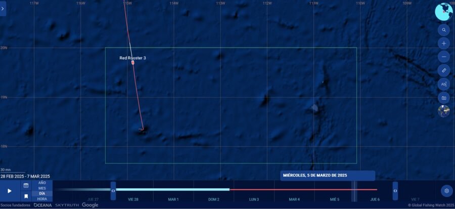 Asimismo, el 5 de marzo de 2025, se recibió por medio de la plataforma satelital, el aviso de entrada de la embarcación al polígono del Parque Nacional Revillagigedo, dirigiéndose a la isla Clarión. El 6 de marzo se continuó con el monitoreo, logrando apreciar que llegó a las inmediaciones de la isla Clarión aproximadamente a las 04:10 am.