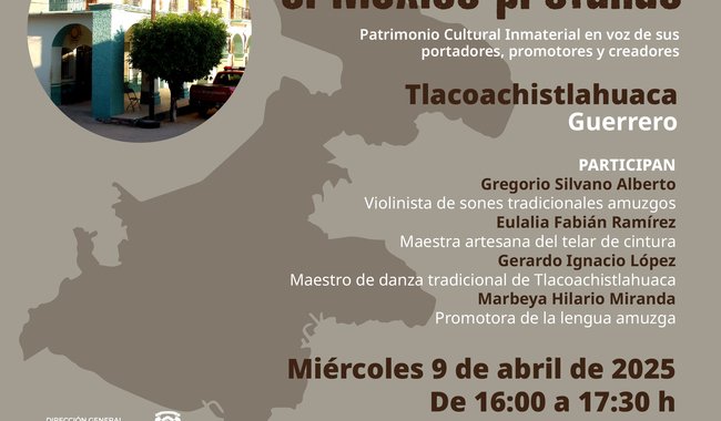 Para abordar estas y otras expresiones identitarias de Tlacoachistlahuaca, estarán presentes el violinista e intérprete de sones amuzgos Gregorio Silvano Alberto, la artesana textil Eulalia Fabián Ramírez, experta en la técnica de telar de cintura, el maestro de danza tradicional Gerardo Ignacio López y la promotora de la lengua amuzga Marbeya Hilario Miranda.