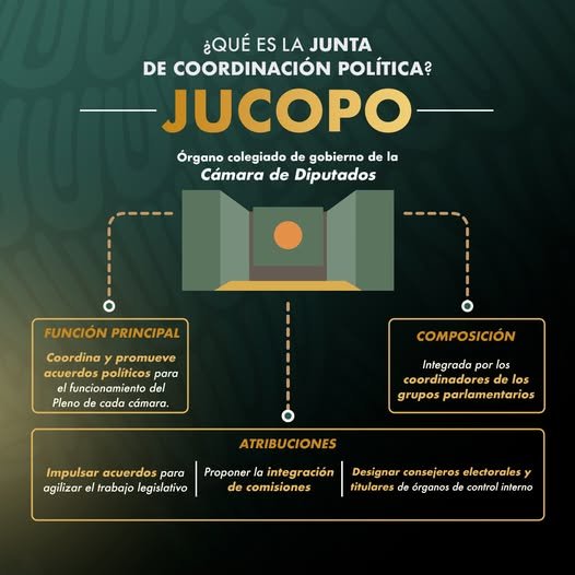 La Junta de Coordinación Política (Jucopo) es un órgano de gobierno de la Cámara de Diputados, al cual le corresponde impulsar entendimientos y acuerdos para el desahogo de los asuntos legislativos. Conoce más sobre su trabajo y funciones: