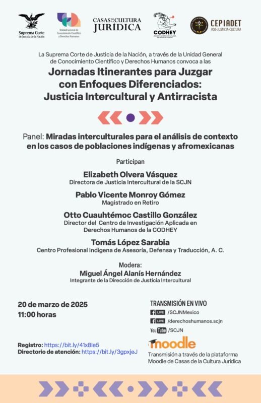 Suprema Corte de Justicia de la NaciónInfografías La Unidad General de Conocimiento Científico y Derechos Humanos convoca a las «Jornadas Itinerantes para Juzgar con Enfoques Diferenciados: Justicia Intercultural y Antirracista». Por Araceli Bastida - marzo 15, 2025 0 FacebookTwitterPinterestLinkedinReddItEmailWhatsAppTelegramVK