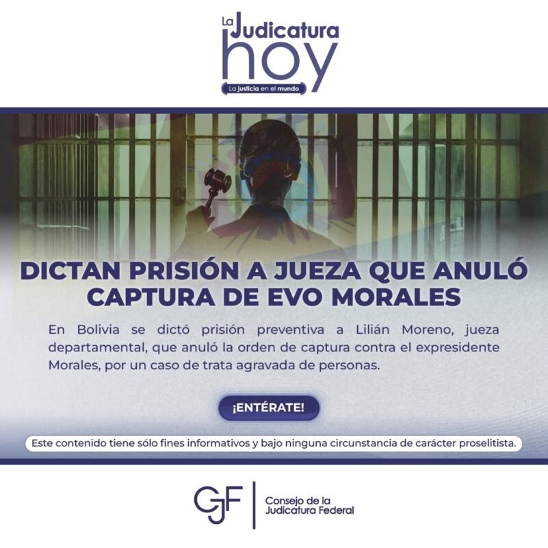 Consejo de la Judicatura FederalInfografías #LaJudicaturaHoy | La jueza fue enviada a la cárcel de Palmasola, en Santa Cruz, donde deberá permanecer al menos un mes como parte del proceso en su contra. Por Araceli Bastida - mayo 19, 2025 0 FacebookTwitterPinterestLinkedinReddItEmailWhatsAppTelegramVK