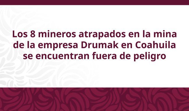 Derivado del incidente, ocurrido a las 15:00 hrs. en la mina operada por la empresa Drumak SA. de CV. en el municipio de Sabinas, Coahuila, donde 8 mineros vieron impedida su salida, se informa que las personas trabajadoras se encuentran fuera de peligro y con sus familiares. Los trabajos de rescate, operados conforme a los protocolos del centro de trabajo, concluyeron hacia las 22:58 hrs.