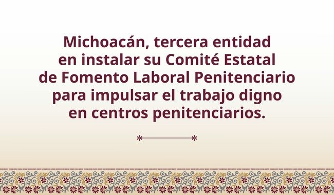 - La instalación del Comité Estatal de Fomento Laboral Penitenciario de Michoacán es resultado de la coordinación interinstitucional y del acompañamiento brindado por la STPS para fortalecer las capacidades técnicas de las entidades federativas en esta materia.