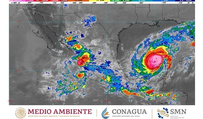 Su amplia circulación mantendrá el pronóstico de lluvias puntuales torrenciales (de 150 a 250 milímetros [mm]) en Campeche, el norte de Quintana Roo y Yucatán, intensas (de 75 a 150 mm) en Tabasco y Veracruz; así como rachas de viento de 180 a 200 km/h, oleaje de 6 a 8 metros (m) de altura y posible formación de trombas marinas en las costas norte de Campeche, el norte de Quintana Roo y Yucatán; rachas de 100 a 120 km/h y oleaje de 4 a 6 m de altura en las costas de Veracruz y Tabasco. Asimismo, se prevé marea de tormenta de 1 a 3 metros sobre Campeche, el norte de Quintana Roo y Yucatán.