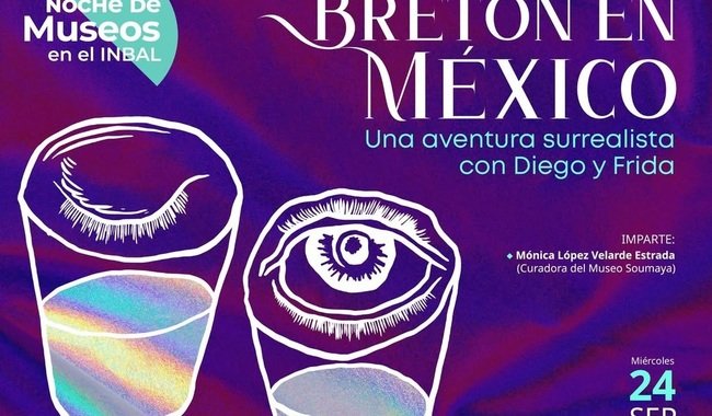 Breton en México: una aventura surrealista con Diego y Frida es el título del conversatorio que impartirá la curadora del Museo Soumaya, Mónica López Velarde. En él hablará sobre la estancia de André Breton en México y su relación con los pintores Frida Kahlo y Diego Rivera. La cita es el miércoles 24 de septiembre, a las 19 horas, en el Museo Casa Estudio Diego Rivera y Frida Kahlo (MCEDRyFK), del Instituto Nacional de Bellas Artes y Literatura (INBAL).