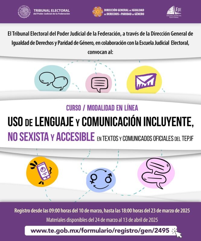 Participa en el «Curso: Uso de lenguaje y comunicación incluyente, no sexista y accesible en textos y comunicados oficiales del TEPJF», modalidad en línea.