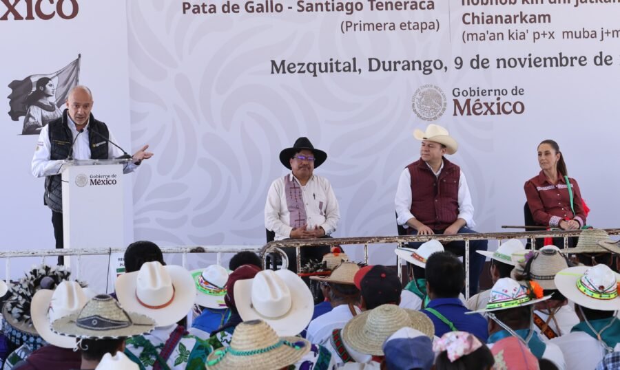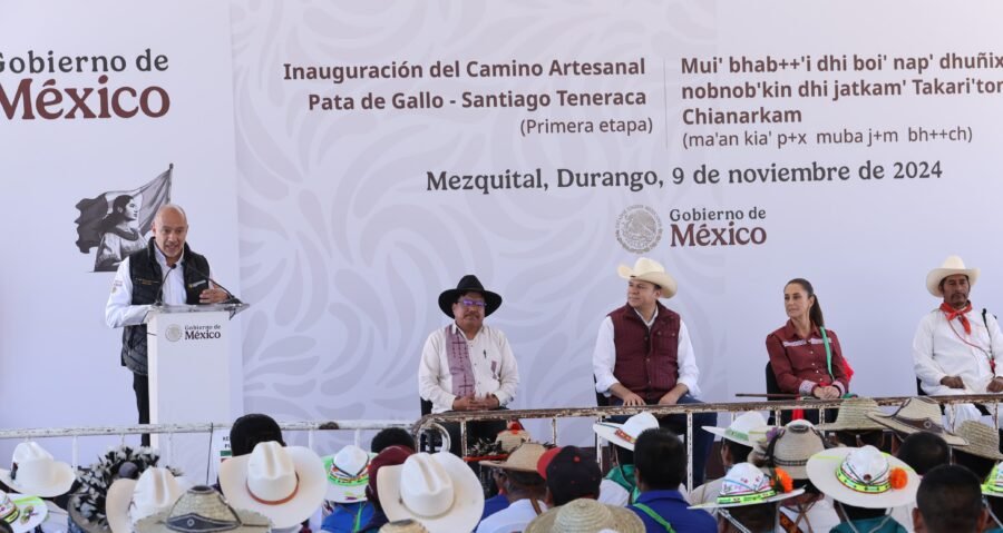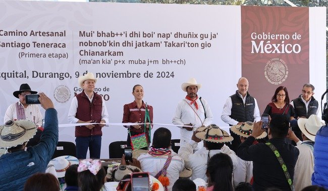 • El titular de la SICT acompañó a la presidenta Claudia Sheinbaum Pardo a la inauguración del Camino Artesanal Pata de Gallo-Santiago Teneraca • En Durango se han construido 52.55 kms con una inversión de un poco más de 300 mdp; 6 caminos ya fueron concluidos y 3 están en proceso • La obra que hoy se inaugura son los primeros 5 kilómetros entre Pata de Gallo y la comunidad de El Frijol y de ahí hasta Santiago Teneraca que son 30 kilómetros • El Programa de Caminos Artesanales a nivel nacional suma 3,835 kms en 10 estados con una inversión de 17,800 mdp y cerca de 73 mil empleos generados