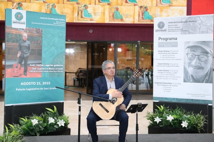 Palacio Legislativo de San Lázaro, 23-08-2025.– En la Cámara de Diputados se realizó, como parte del ciclo “La Guitarra en México y el Mundo”, el concierto “Geometrías del Silencio” con el artista Juan Carlos Laguna, como un homenaje al maestro luthier Masaki Sakurai, quien falleció recientemente.