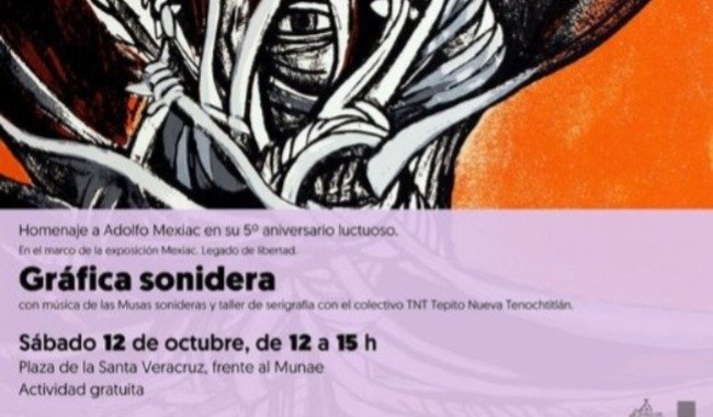 En la Plaza de la Santa Veracruz, donde se ubica el Museo Nacional de la Estampa (Munae), del Instituto Nacional de Bellas Artes y Literatura (Inbal), se celebrará un homenaje a Adolfo Mexiac en su 5º aniversario luctuoso, en colaboración con el colectivo TNT Tepito Nueva Tenochtitlán y las Musas sonideras, quienes llevarán a cabo una Gráfica sonidera el sábado 12 de octubre de 12:00 a 15:00 h.